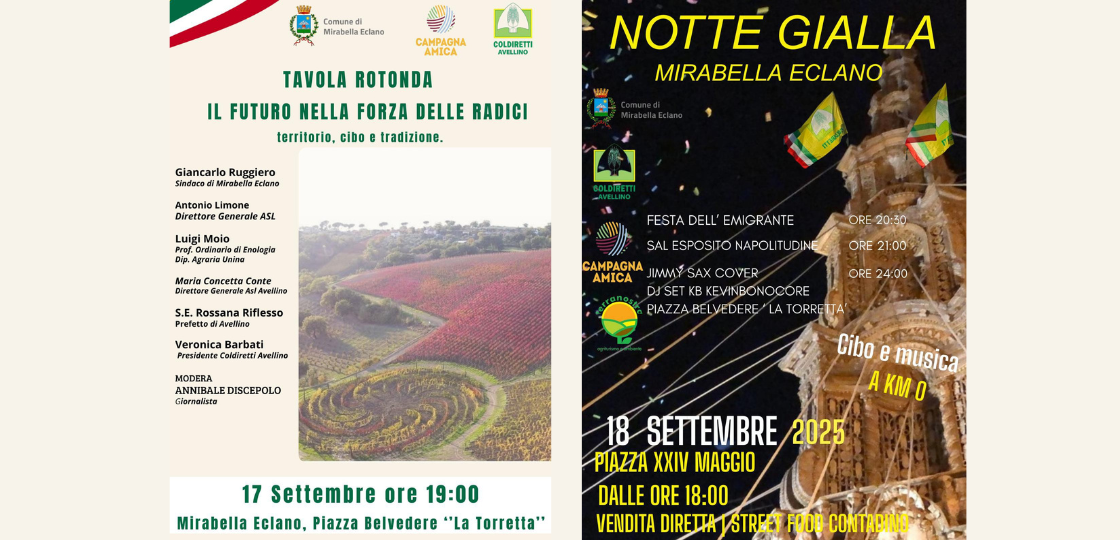 Le Notti Gialle di Coldiretti Avellino fanno tappa a Mirabella Eclano. L’appuntamento, che si inserisce nel ricco cartellone del Settembre Eclanese, è per mercoledì 17 e giovedì 18 settembre con un programma che mette al centro eccellenze agroalimentari, tradizioni e cultura.