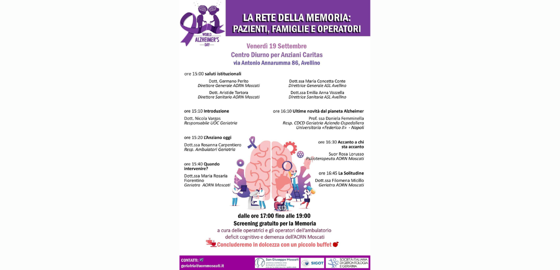Gli anziani che frequentano il centro saranno accolti dai geriatri dell’Azienda Moscati – tra cui Rosanna Carpentiero, Maria Rosaria Fiorentino e Filomena Micillo – che effettueranno gratuitamente il test della memoria, uno strumento semplice ma fondamentale per la diagnosi precoce delle demenze. Non solo visite: mentre i medici si prenderanno cura degli ospiti, i familiari e i caregiver potranno partecipare a un momento di incontro e di dialogo, per ricevere consigli e informazioni utili sulla gestione quotidiana delle persone fragili. Il momento informativo, introdotto dal presidente del Centro diurno per Anziani, Alfonsina Nazzaro, vedrà gli interventi dei Direttori generali dell’Azienda Moscati e dell’Asl Avellino, rispettivamente  Germano Perito e Maria Concetta Conte, e dei Direttori sanitari delle due Aziende, Aristide Tortora ed Emilia Anna Vozzella: un confronto tra i protagonisti della sanità irpina, segno del rinnovato impegno nel costruire una rete di prossimità e di continuità ospedale-territorio, che metta insieme pazienti, famiglie e operatori, offrendo vicinanza, ascolto e qualità delle cure. Al dibattito porteranno la loro esperienza anche Daniela Femminella, responsabile del Centro Disturbi Cognitivi e Demenze dell’Università degli Studi Federico II di Napoli, l’organizzatore dell’evento, Nicola Vargas, e suor Rosa Lorusso, psicoterapeuta dell’Azienda Moscati, che aggiungeranno un contributo scientifico e umano al tempo stesso. Il pomeriggio al Centro diurno per Anziani sarà così un’occasione da un lato per dimostrare che la sanità non si limita a curare, ma va incontro ai bisogni delle persone, portando prevenzione e vicinanza direttamente sul territorio, dall’altro, per conoscere le persone fragili là dove trascorrono parte del loro tempo, circondate da volontari che animano i pomeriggi coinvolgendo gli ospiti in attività sociali, ricreative, in laboratori: momenti relazionali che aiutano a combattere la solitudine e l’isolamento.