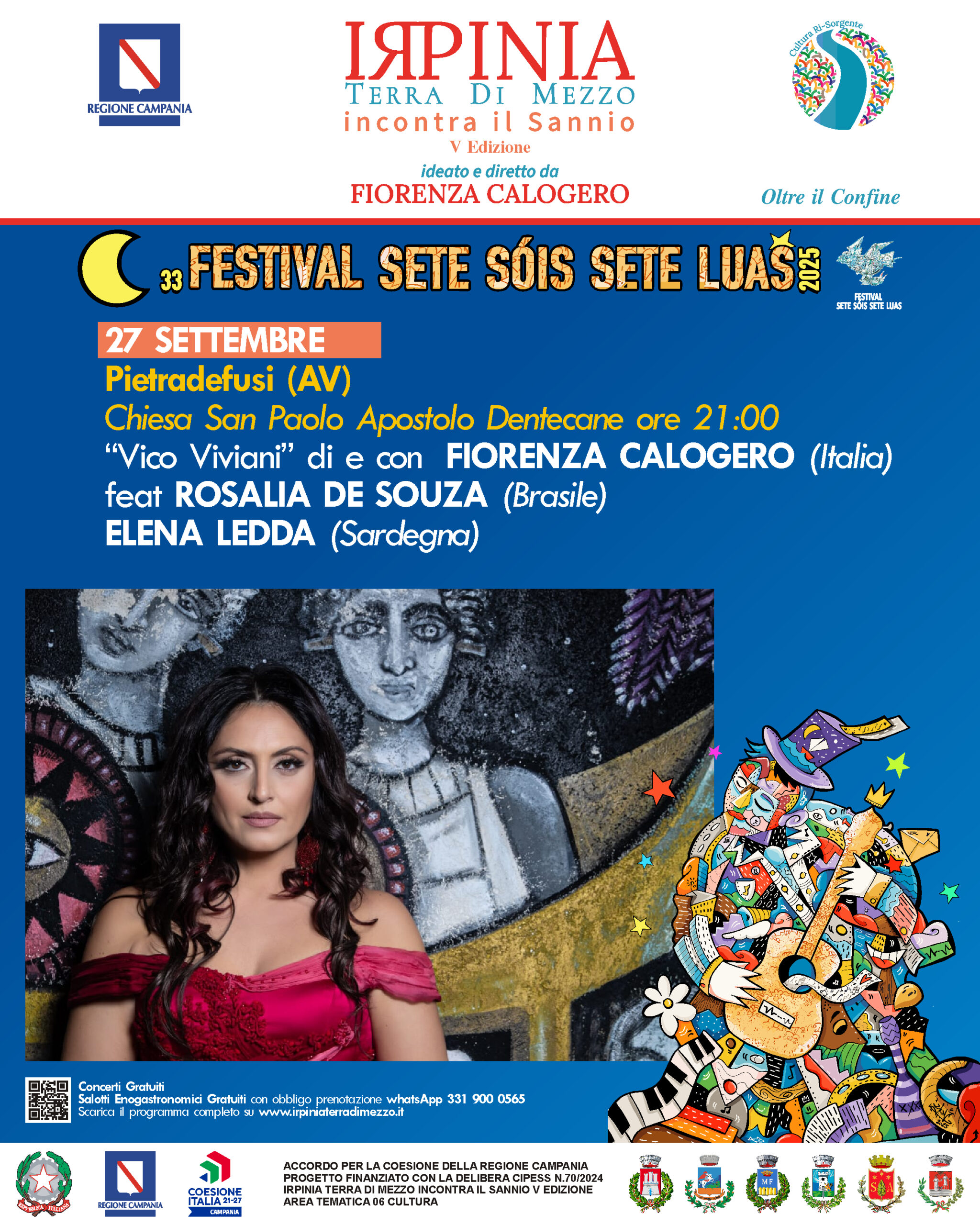 La produzione, ideata e interpretata da Fiorenza Calogero – direttrice artistica di Irpinia Terra di Mezzo -vedrà la partecipazione straordinaria di tre artiste di caratura internazionale: Rosalia De Souza dal Brasile, Elena Ledda dalla Sardegna e Patrizia Spinosi da Napoli. Un incontro tra lingue, culture e identità che, attraverso i testi e le musiche immortali di Raffaele Viviani, creerà un ponte ideale tra la tradizione napoletana, le sonorità del Mediterraneo e i ritmi del Brasile.