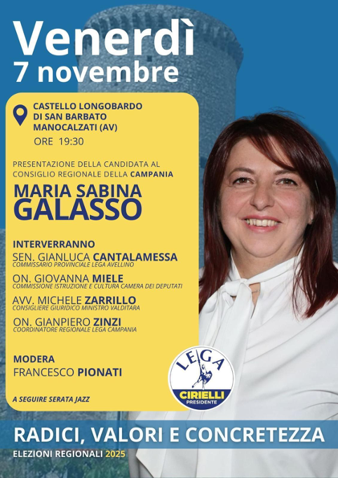 Avrà luogo a Manocalzati la presentazione della candidata al Consiglio regionale della Campania, Maria Sabina Galasso con gli interventi del senatore Gianluca Cantalamessa, commissario provinciale della Lega Avellino, l’onorevole Giovanna Miele, componente della Commissione Istruzione e Cultura della Camera dei Deputati, l’avvocato Michele Zarrillo, consigliere giuridico del ministro Valditara e l’onorevole Gianpiero Zinzi, coordinatore regionale della Lega Campania. L’evento, moderato dal giornalista Francesco Pionati, avrà luogo venerdì prossimo, 7 novembre, a Manocalzati presso il Castello di San Barbato, alle 19:30.