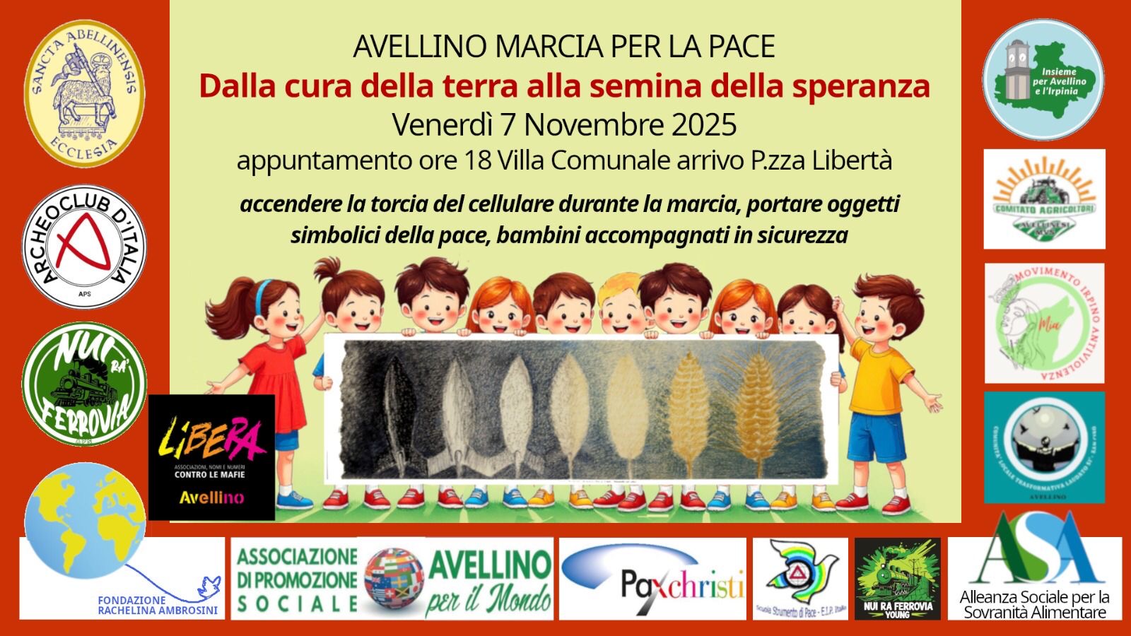 Venerdì 7 Novembre 2025 appuntamento ore 18 Villa Comunale arrivo P.zza Libertà accendere la torcia del cellulare durante la marcia, portare oggetti simbolici della pace, bambini accompagnati in sicurezza