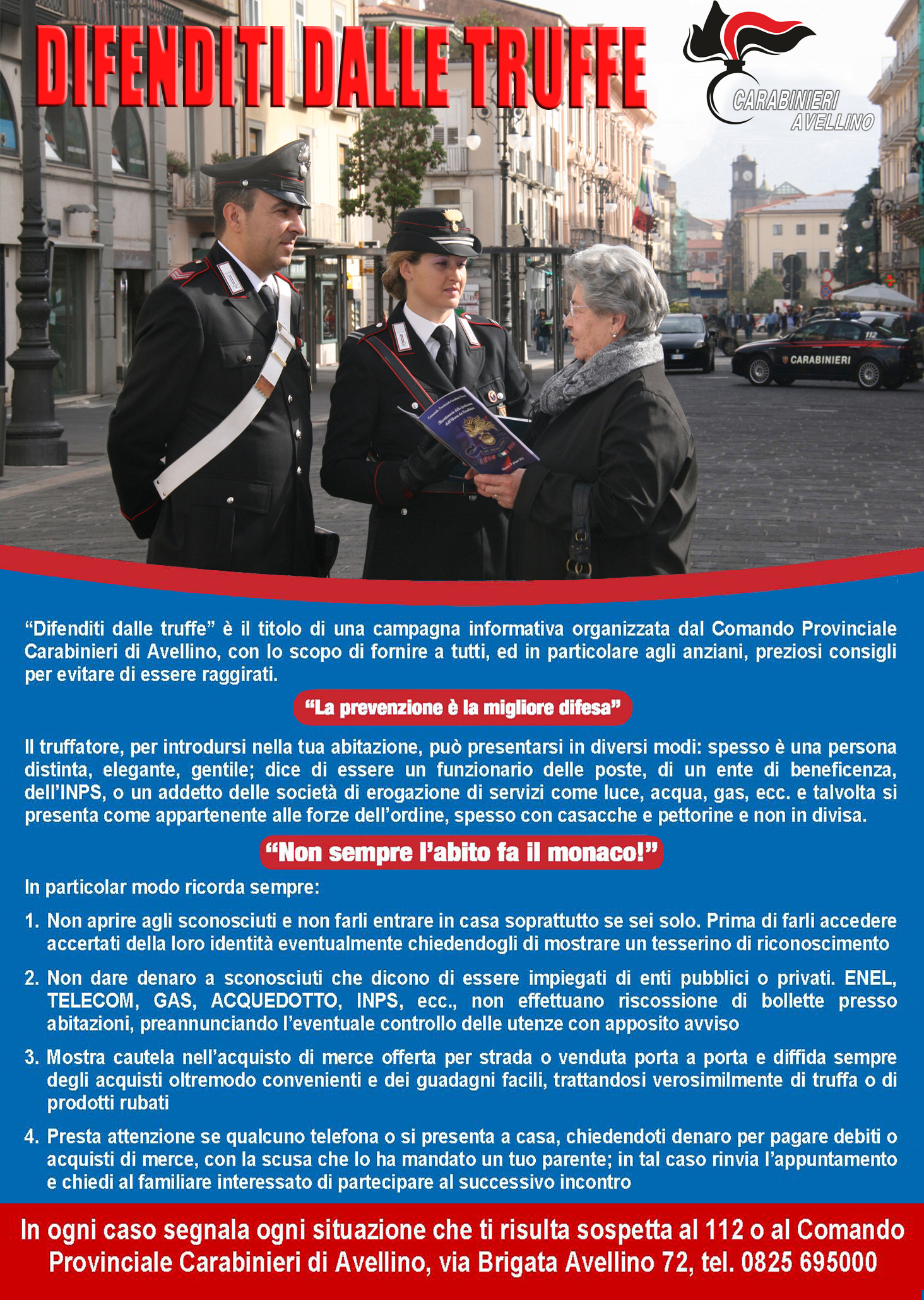 In questo contesto, il Comando Provinciale dei Carabinieri di Avellino ha deciso di rinnovare la campagna di comunicazione diretta alla parte della popolazione maggiormente colpita da questi eventi, allo scopo di rafforzare la prevenzione e accrescere la funzione di rassicurazione sociale.