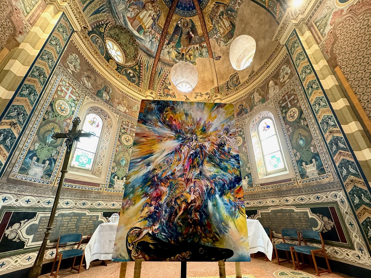 Difatti tra le opere d’arte dedicate alla patrona dell’Arma, spicca per intensità e raffinatezza quella realizzata da Mario Vespasiani, già considerata tra i capolavori pittorici sul tema. L’artista, attraverso un olio su tela di rara forza espressiva, ha superato la semplice dimensione devozionale per offrire una lettura profonda, attuale e originale del suo significato simbolico. In questa tela la Vergine non è figura statica né mera icona, bensì appare come una presenza viva, luminosa, capace di avvicinarsi allo sguardo e di restare impressa nel cuore. Vespasiani, grazie a un linguaggio pittorico intenso – fatto di contrasti, velature e cromie decise – evoca una spiritualità vibrante, filtrata attraverso una sensibilità fuori dal comune. Maria emerge come colei che custodisce, protegge e continua a vivere dentro di noi: salda nell’amore eterno, non figura come un’entità distante o astratta, ma profondamente inserita nel nostro tempo, alla cui base fa da richiamo il cappello del Carabiniere. La scelta della tecnica ad olio ha permesso all’artista di dare energia alla luce, trasformando la Madonna in un punto di orientamento, proprio come lo è per l’Arma nella sua missione quotidiana. Vespasiani coglie e restituisce l’essenza del titolo Virgo Fidelis: non soltanto purezza o maternità, ma fedeltà come forza interiore, radice di ogni gesto di coraggio. Nel suo dipinto la Vergine Maria diventa il rimando simbolico in cui l’Arma fonda la propria vocazione: esserci, proteggere, custodire. La ricorrenza odierna intrecciando memoria religiosa, storia nazionale e identità istituzionale è un emblema di fedeltà scelta e testimoniata e che l’artista ha letto anche in riferimento ai valori trasmessi fin dal bambino dal babbo Rodolfo. Il dipinto di Vespasiani, con la sua intensità poetica e la sua forza simbolica, amplifica questo messaggio offrendo una delle interpretazioni più profonde e luminose della patrona dei Carabinieri.