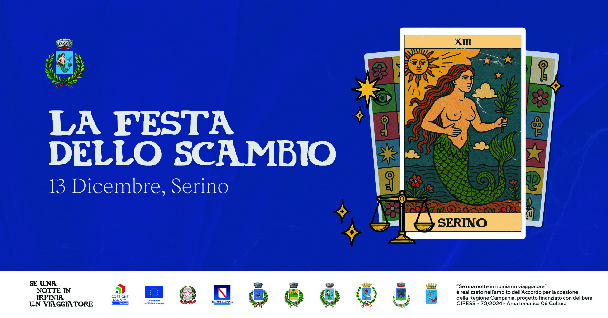 A Serino, dove la sirena è simbolo del Comune, Trallallà realizzerà una grande sirena su un drappo amovibile. L’opera resterà esposta per tutta la durata della Festa dello Scambio al Mercato e, successivamente, sarà trasferita nella casa comunale, disponibile per ulteriori esposizioni e nuove collocazioni sul territorio comunale.
