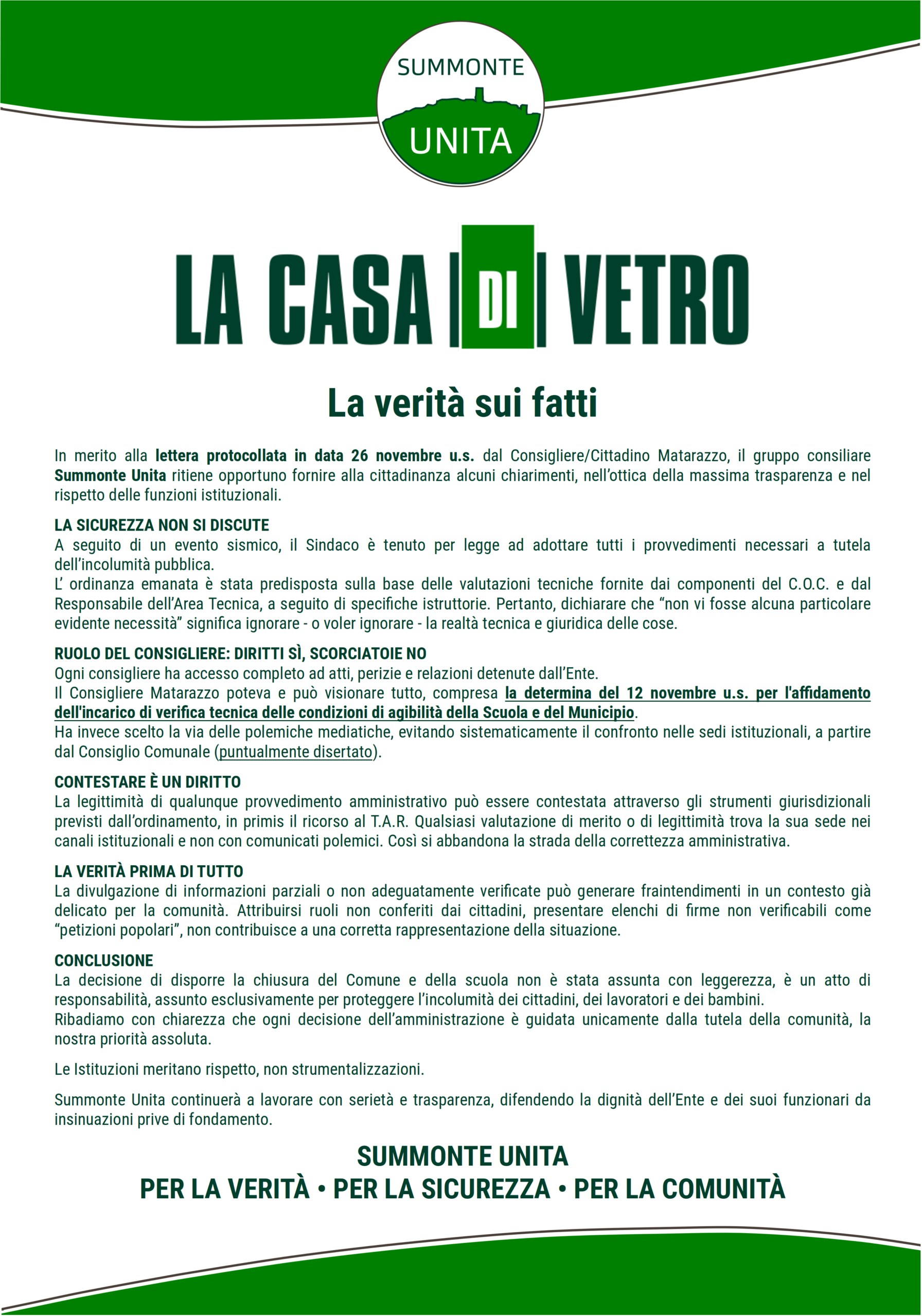 Nel solco del manifesto “La Casa di Vetro”, Summonte Unita sottolinea che ogni decisione adottata dall’Amministrazione comunale è orientata esclusivamente alla tutela della sicurezza e dell’incolumità dei cittadini. In particolare, i provvedimenti in materia di sicurezza pubblica – inclusi quelli legati a eventi sismici o all’affidamento di incarichi tecnici – vengono assunti sulla base di valutazioni formali e documentate degli organismi competenti, come il Centro Operativo Comunale e il Responsabile dell’Area Tecnica. Ignorare o omettere tali valutazioni non è ammissibile, né sul piano normativo né su quello morale.